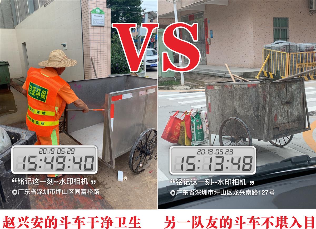 值得一提的是那天检查龙田一队时,发现了二个极端,其中有一个员工的斗车已经锈迹斑斑、脏乱不堪,从来没有清洁过,根本看不出来是不锈钢的斗车,严重影响了公司的形象。“一屋不扫,何以扫天下”,自己的环卫工具都不清洁,又怎么能把环卫工作做好!另一个极端就是赵兴安最干净最漂亮的斗车,形成了极其鲜明的对比。
